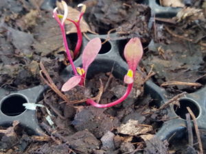 (左)20年3月15日の撮影でデトロイトレッドの発芽です。土は腐葉土にスーパーゆうきを混ぜたものでした。