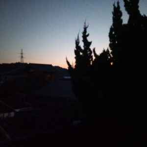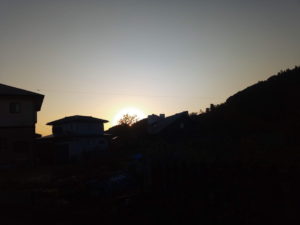 (右)太陽が山の向うへ降りて行きます。