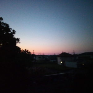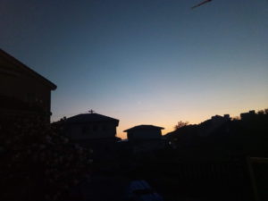 5時46分、穏やかですが、全天に広がりそうな朝焼けが始まりました。西南西の一部(水平線近く)もほんのりと染まっています。