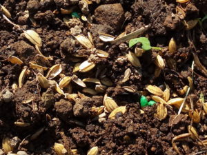 (左)埋めた筈のジュエルレッド(二十日大根)が出て来ました。猫達に荒らされた気配はありません。種は発芽の直前に殻を地上に押し上げて来ます。