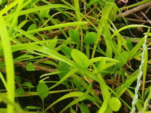 (中)物干しの浅いプランターに発芽した次郎丸ホウレンソウの本葉が出て来ました。