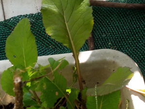(右)同じく物干しのプランターに出た零れ種は、根元には暗赤色の根が出来ています…デトロイトレッドビーツ!?今春に花が咲いていましたから、零れ種です。大して大きな莢が着いた訳ではなかったし、まさかビーツの零れ種が発芽するなんて、想像だにしませんでしたから、今朝までラディッシュだと思い続けていました。