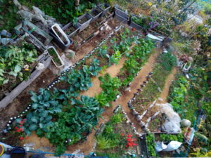 6時45分の庭です。徐々に二畝の玉葱畝が緑になって来ました。4畝のカリフラワーには花蕾が出て来たものもあります。