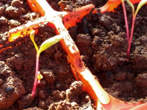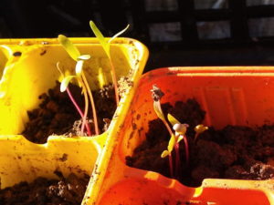 ラディッシュを3-4粒ずつ蒔いて見ましたが、5日程で発芽しました。最初に緑色に着色された種が地上部に上がって来て…多分先に根を下しているのでしょう…赤い茎が来て種の中から双葉を抜いて開きます。凄い力です。ハッと気づくとクリーム色の発芽したばかりの開いていない双葉が、決して弱弱しくは無いのですが、ジッとお日様の光を受け、数時間で緑に変り茎も天を指し、写真の様になります。双葉の中心には、まだ本葉も覗いていません。