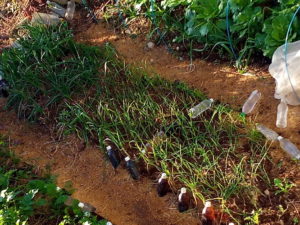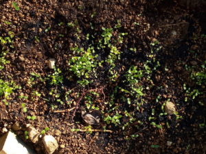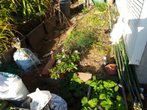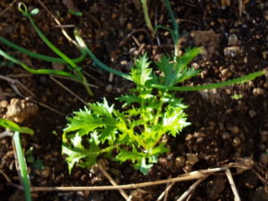 (中)韮が数本発芽しています。手前の幅広の葉はイネ科でしょうね。抜くと韮も抜けちゃいそうだから、後でチョッキンします。