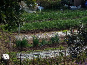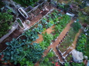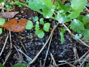 (右)大根です。私は間引きして一本になんてしないんです。ある程度の数(5―6粒)であれば、大根同士都合して一緒に育ちます。きついだろうけれどね。だから私が間引きしたりするよりも、大きいのを抜いて頂いて、細いのが太るまで待ちます。