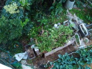 (左)梅の樹脇にあった堆肥の土を盛ったジャガイモプランターで発芽。5畝と同じ種類の菜っ葉です。