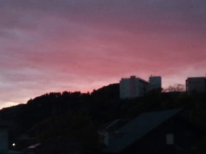 16時26分の夕焼けです。右はそのアップで、肉眼で見た色に近いです。。