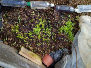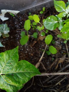 (左)梅の樹脇にあった堆肥の土を盛ったジャガイモプランターで発芽。5畝と同じ種類の菜っ葉です。