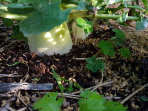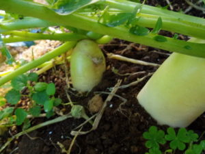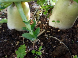 (右)大根です。私は間引きして一本になんてしないんです。ある程度の数(5―6粒)であれば、大根同士都合して一緒に育ちます。きついだろうけれどね。だから私が間引きしたりするよりも、大きいのを抜いて頂いて、細いのが太るまで待ちます。