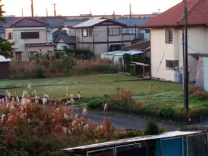 霜で草が倒れているのがわかりますか?瓦屋根は霜が付いて居ませんが真ん中のお家の屋根は白くなっていますし、赤い屋根のSさんの裏の空き地も霜で白くなっています。家の屋根も白いかな、と表に出てみましたが、時間が経ったからか、白くなっていませんでした。屋根材によるのでしょうね。