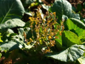 (右)春の零れ種で夏に発芽していたグルノーブルレッド(サニーレタス)です。途中で茎が伸びて、あれぇ?春のレタスになって仕舞いました。今、黄色の花を着けています。