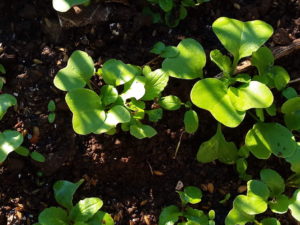 (左)ほうれん草も丸い本葉が出て来ました。