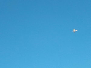 6時11分、余りハッキリしませんが、東北東に雲があります。発達するかどうか、を注視します。右の写真は中心の枝の上、写真の縦中央の辺りに国内線が飛んでいるのを撮りました。見えないですね。拡大してようやく見えます。人間の目は本当に凄いです!