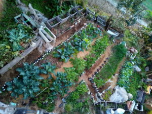 お隣の大蒜畝の草取りをしましたので、新堆肥枠に少し草が入りました。福とうめが周りにウロウロしていました。