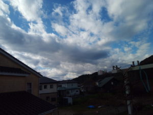 (左)12時13分西南西からの雲は消えません。やはり地震雲なんですね。(中)15時39分、真北は雲の蓋です。(右)我が家の真裏に釈。