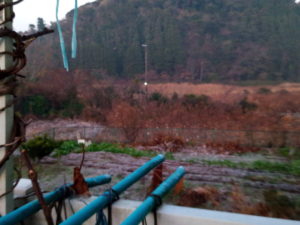15時29分真ん中の竹やぶの近くに虹が未だあります。家へ曲がる処で振り返ると浅間様の山に釈がハッキリしていました。