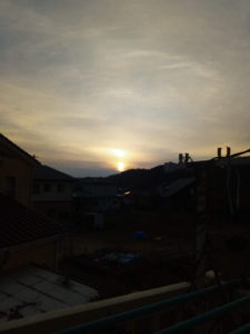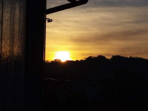 物干しで洗濯ものを干していたら、太陽が上がって来ました。7時過ぎ。