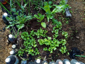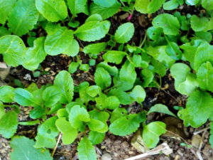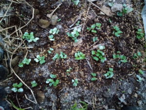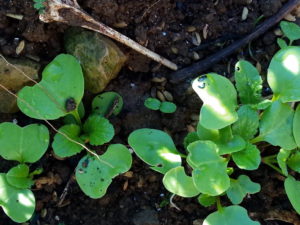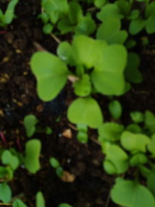 ラディッシュ・ジュエルレッドの本葉が密集して来ました。。中と右はレタスの苗がレタスらしくなって来ました。