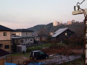 (一昨日の朝の写真です。昨日は東北東に鱗雲っぽい雲が広がって居ました。)茨城県沖と書いてあった気がして…さっき見たら時間も6分から15分に変って居ました。写真も変更しました。25日の午後の写真です。白い一文字が北東から出ています。もう一枚は26日18時です。夕日に気をとられていましたが、直ぐ手前の黒い雲は北をさして居ました。