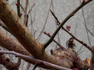 実梅が盃型になっています。右から出ている枝の蕾がこの樹の一番早く花を咲かせる蕾になりそうです。
