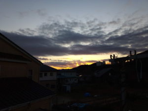 (一昨日の朝の写真です。昨日は東北東に鱗雲っぽい雲が広がって居ました。)茨城県沖と書いてあった気がして…さっき見たら時間も6分から15分に変って居ました。写真も変更しました。25日の午後の写真です。白い一文字が北東から出ています。もう一枚は26日18時です。夕日に気をとられていましたが、直ぐ手前の黒い雲は北をさして居ました。