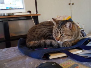 昨夜タイガーさんは湯たんぽの反対側で寝て居ました。私の掛け布団との間で狭いけれどなかなか居心地は良さそうでした。それと言うのも一昨日の夜、いつもの様に自分の今までの寝場所で寝ようとしたら叔父さん猫2匹が居たので、『クック!(人の言葉ではゲーッ!)僕の場所に叔父さん達が寝ている!』と言って棚の上に行きました。