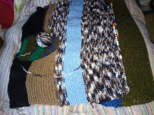 一旦、首回りのダブルゴム編みを入れました。なんか前身ごろが短いので、もう一度、編み足します。。