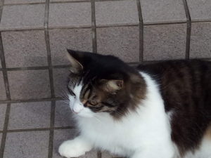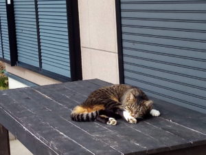 7時、トラ子が戻ってカリカリを食べて、物干しで涼んで?居ます。カリカリをたっぷり食べて7時半にお出かけです。一匹にカリカリを上げると、他の猫からの視線をジト―ッと感じます。結局、全員がカリカリを食べました。