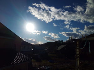 14時57分の青空。右、16時2分の黄金色の太陽。
