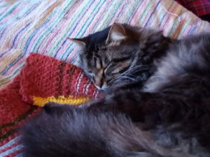 お祖母ちゃんが編んだ襟布は猫達に取られてしまいました。うめとトラ子が気に入った、と離しません。