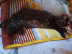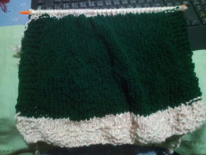 マフラー(将来的には毛布)の編み目をナイロン紐で拾いました。別の糸で縞々マフラーを編み始めました。頂いた糸を繋いで縞々セーターを解いて編んでいるので、縞々にならざるを得ません。