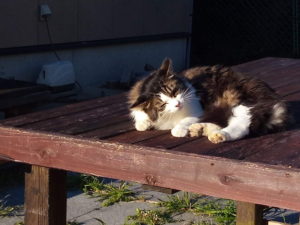 左から福(西隣さんのテーブルで私を呼んでいます)、トラ子はお祖母ちゃんの敷物が大好き、うめは女の仔だから甘え方が男の仔達と全然違います。お隣のタイガーさんは夜も昼間も我が家に寝に来ます。