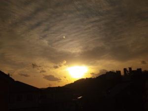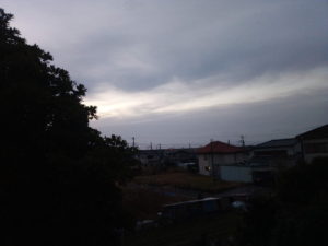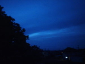6時11分、雲の向うで光が強くなり始めました。珍しい青の時間。東を起点とする一文字か釈が出ています。