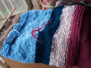 120㎝になりました。後2段で平編みはお終いです。薄茶色に移りました。一本の中で半分くらいは新しい糸を入れたいのですよね。どうしても中古の糸は弾力が無いから、模様がきっちり出ません。