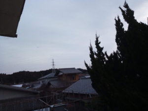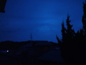 6時11分、雲の向うで光が強くなり始めました。珍しい青の時間。東を起点とする一文字か釈が出ています。