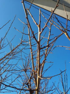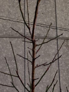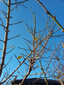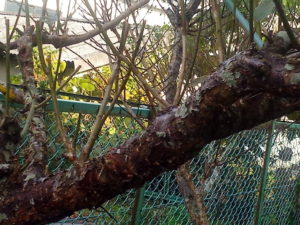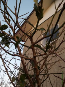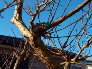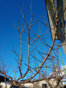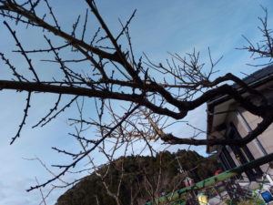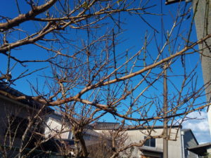 夏剪定をするようになって二回目の夏でしたが、横枝に出た垂直枝をここで処理しておくと、休眠期に入ってからのお世話が楽でした。11月前半では花芽か葉芽か見分けがつき難い事もありました。園芸書などでは”葉芽は尖って、花芽は丸い”と書かれていましたが、我が家の実梅の蕾は1月も下旬の今でもツンと尖っています。