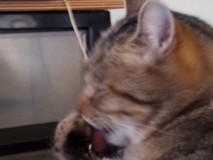 8時過ぎにトラ子が戻ってご飯を食べ直し、私の横まで東から差して来る日を浴びて、日向ぼっこしていました。