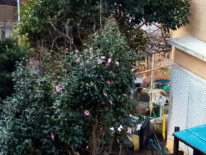 椿が満開に向かっています。29日が満月です。右: ビーツ・チオギアを物干しのプランターに移植したものです。