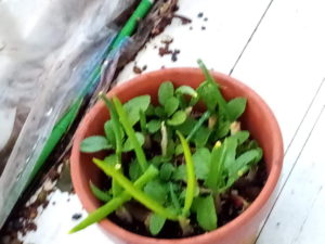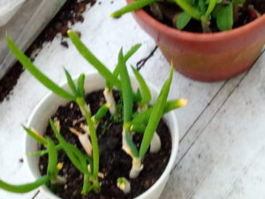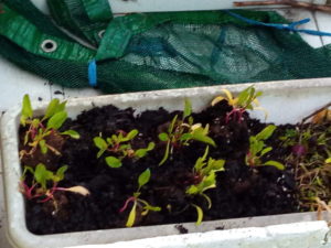 葱が伸びて来ました。これは出来れば今日、ジャガイモのプランターに移植します。この位になれば大丈夫です。右: ラディッシュ・ジュエルレッドと葱の混植を試しています。