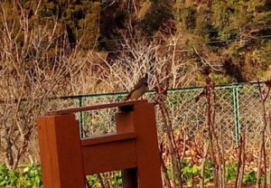 表に出たらジョウビタキさんが飛んで来ましたが、足元にはうめも飛んで来てスリスリしています。珍しい!北東―東北東を起点とする釈です。
