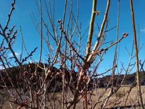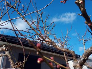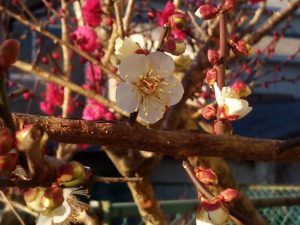 西隣さんから見た鹿児島紅と実梅。実梅の白い花。奥の枝に咲いた新しい花。