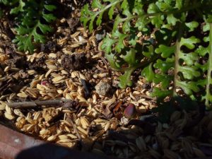 左: 玄関前のネモフィラの鉢に植えたチューリップの発芽です~♪ 赤っぽい、三角形の芽が出ています。12月25日、X’mas に届いてその日に植えました。1ヵ月一寸で発芽です。去年のアンジェリケもこの位から出ていたのかなぁ。プランターでネモフィラの生長が良かったからネモフィラを掻き分けて出て来るまで分かりませんでした(笑)。