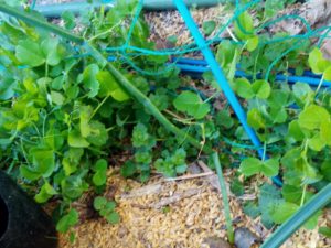 右: 今年は駄目だと思っていた絹さや赤花が復活です。種を差し上げたWさんのお宅では日当たりが良いから既に年末から小さな実を着けていました。我が家の絹さやはもう駄目か、と諦めましたが、活性希釈液を掛けたり施肥をしたりしていました。嬉しいですね。