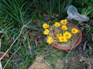 ノースポールに蕾が付いて居ます。これは我が家のクロッカス…10個咲いています。この後、白とブルーが出て来ますよ。東側の、東京で近所にあったマンションの生垣から貰った椿の種を植えたものです。