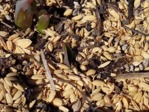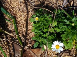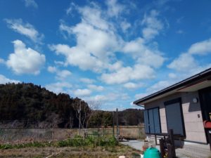 春の様な雲が浮かんでいます。中: ネモフィラの鉢に出て来たキャンザスプラウドの芽です。夏蜜柑の樹の下から西の空が見える様になりました。