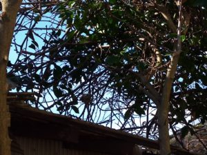 福とうめは比較的近くに居るので、福と喋ればうめが、うめとお話しすると福がやって来ます。キウイの枝切の間中、福はお隣の物置の屋根で日向ぼっこをしていました。こういう処が福ちゃんは可愛い。