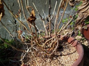 中: 鉢植えの紫陽花ですが、3年目、花を未だ見た事がありません。根元と枝の途中、枝の先端に芽が出ています。