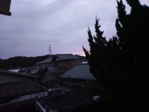 6時10分過ぎ、ようやくこの明るさになりました。東に赤味が見えています。太陽がかなり動きましたね。凄い風で南を撮る時にはガラス越しに撮って仕舞いました。カイヅカイブキに写った赤味は部屋の常夜灯です。