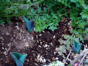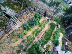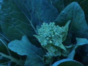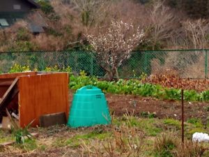 この暖かさと雨のせいでしょうね。ロマネスコが葉を掻き分けて顔を出して来ました。昨日は未だ未だ顔を隠していたい雰囲気でしたのに…。通路にはキウイの枝を細かくしたものを敷き詰めましょう。無料のwoodchipです。